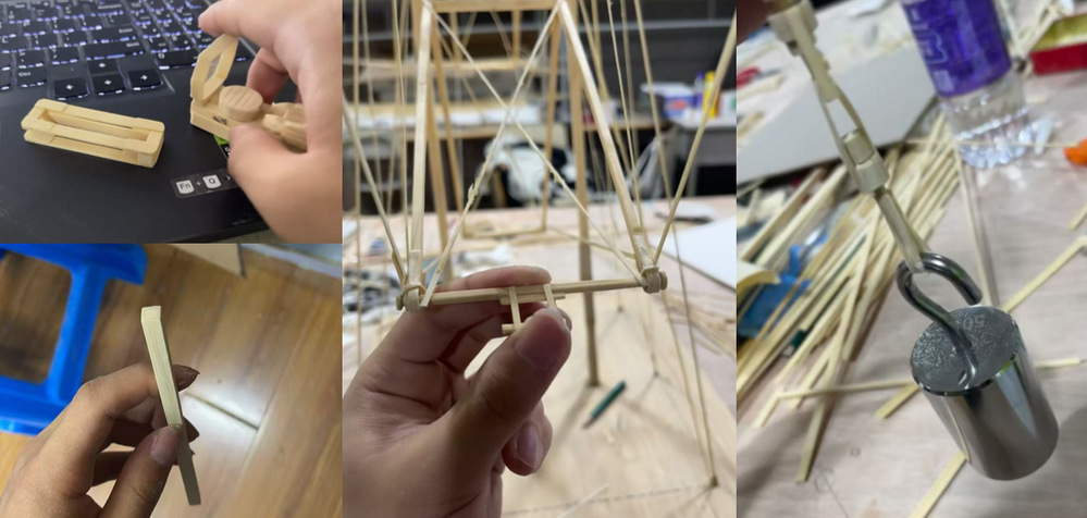 在结构设计中,“毫米”和“克重”是决定成败的关键。今年的结构设计国赛赛题是指定的材料制作绍兴特色的乌篷船,需在规定时间内完成稳定测试、承载力测试、抗撞击测试等多项测试,且模型自重要轻巧,加载重量却需达到自重的数十倍。这意味着,每一克重量的增减都将影响天平的平衡:增加0.1克可能导致结构失去自重轻的优势,而减少0.1克则可能让结构无法达到高承载力的要求。为了让模型既轻便又坚固,沈霖曾为“减少0.1克重量”反复计算。他将竹条宽度从5毫米调整为4.5毫米,把胶水用量从每处0.5毫升减至0.3毫升,甚至用砂纸打磨竹条表面,减少空气阻力对模型稳定性的影响。